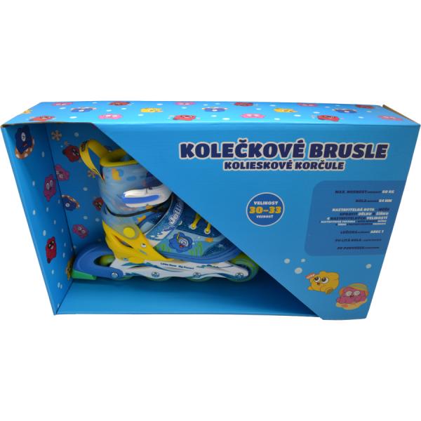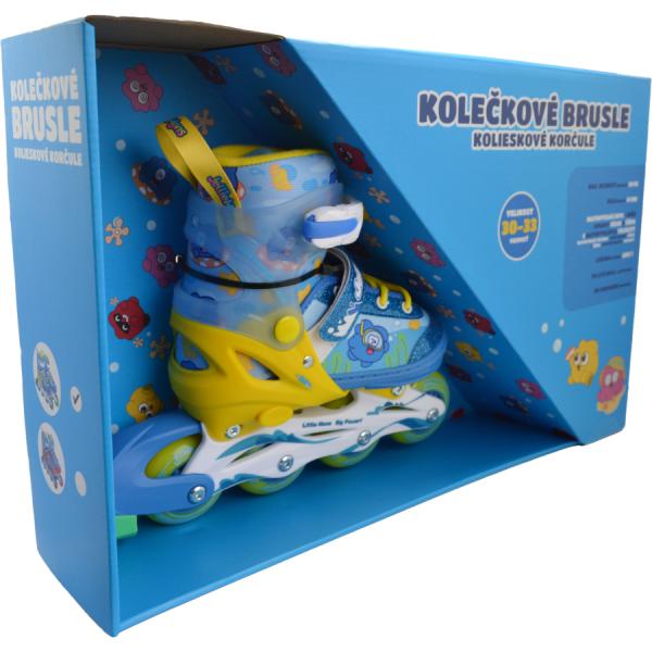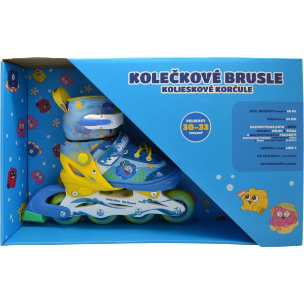 Dětské kolečkové brusle v modro-žlutém designu pro malé dobrodruhy, ideální pro chlapce i dívky. Perfektní volba pro zábavné a sportovní chvíle na čerstvém vzduchu.