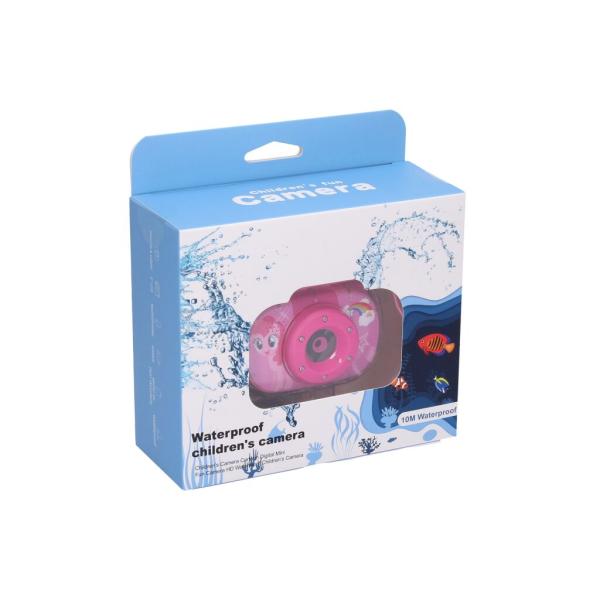 Dětský digitální fotoaparát s vodotěsným pouzdrem – foto 20Mpx, video Full HD. Rozměry 8×2,5×5,5 cm. Výklopný objektiv – slouží také jako selfie kamera. Rozlišení fotografií 20 megapixelů, videa Full HD (1920×1080).