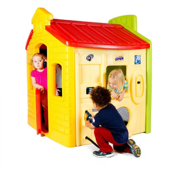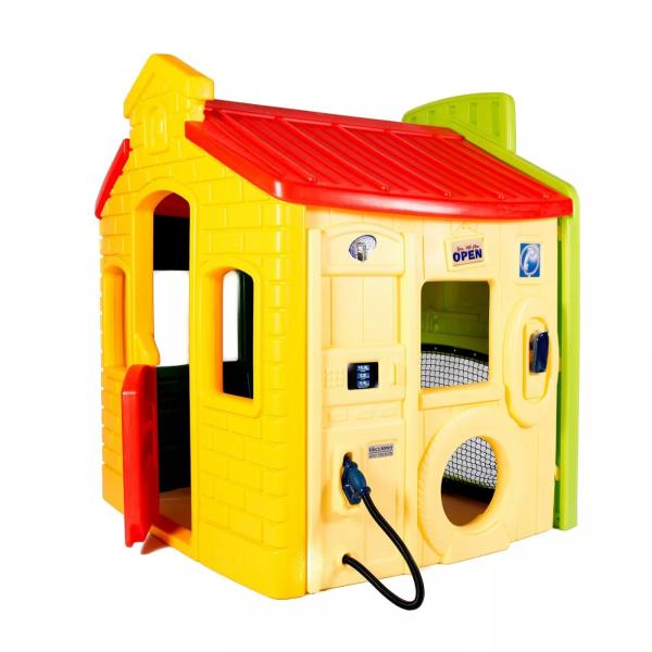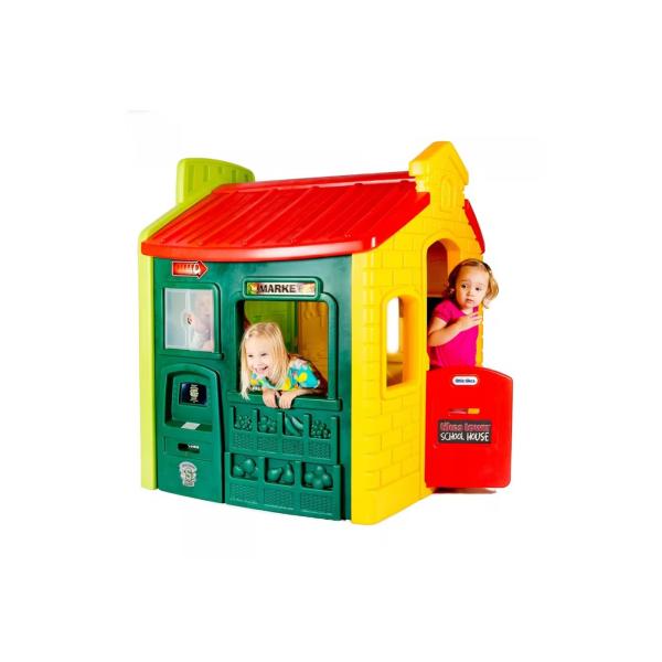 Městský domek na hraní Little Tikes nabízí 4 inspirace pro kreativní hraní. Na každé jeho straně najdete jiné prostředí pro aktivní zábavu! Škola – vchod do budovy školy, uvnitř je umístěn malý stoleček a školní tabule. Benzínová stanice – pomocí čerpací hadice snadno načerpáte palivo, součástí je i mobilní telefon. Banka / obchod – v bankomatu si můžete vyzvednout peníze a pak nakoupit potraviny u okénka pro venkovní prodej, uvnitř domku jsou poličky a přihrádky pro zboží. Sportovní hřiště – pro hru s míčem je zde připravena opravdová fotbalová brána nebo koš na basketbal. Rozměr domku je 125x155x147 cm. Rozměr balení: 148x50x129 cm Vhodný pro děti od 2 let