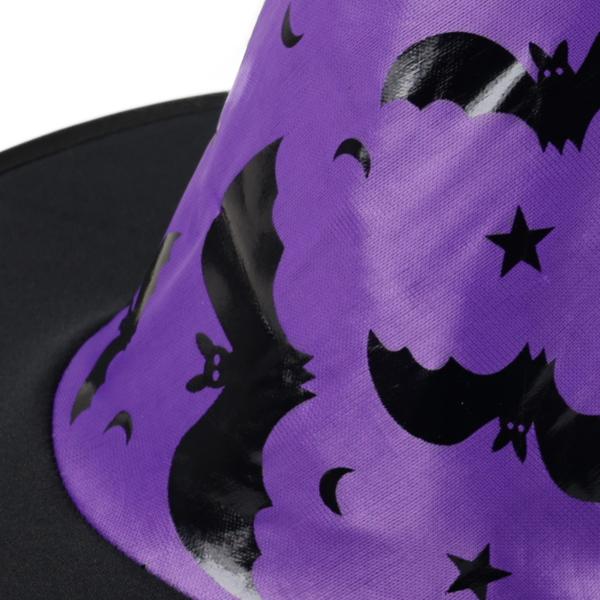 Úžasný kouzelnický klobouk s potiskem ve tvaru netopýrů. Ideální pro halloweenský večírek nebo karneval! Motiv: čarodějnice Výška : 36 cm