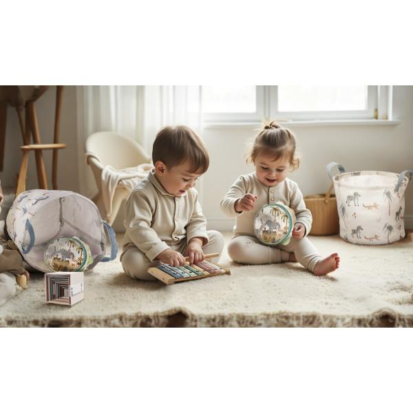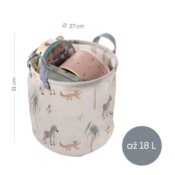 • Rozměry: průměr 27 cm, výška 31 cm• Objem: až 18 litrů – ideální velikost pro každodenní potřeby malých dětí• Lehké a měkké – snadno přenosné díky dvěma pevným látkovým úchytům• Přírodní bavlněný materiál s jemným safari motivem (zebra, liška, palma)
