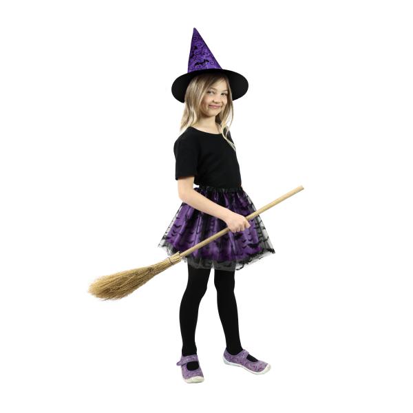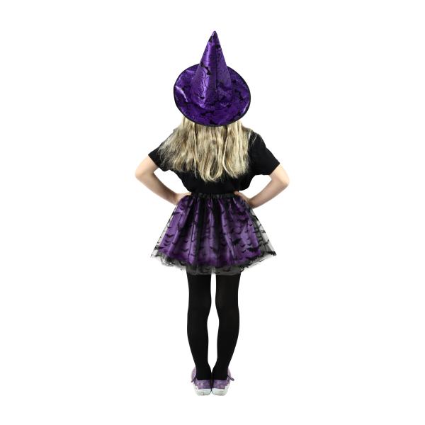 Magický kostým pro malé čarodějnice ve fialové barvě, zdobený černým potiskem netopýrů. Kostým je určen pro holčičky ve věkovém rozmezí 3-7 let.