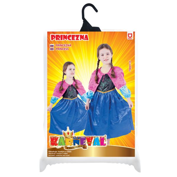 Nádherný dívčí kostým pro všechny sněhové princezny! Kostým ve velikosti S je určen pro holčičky ve věkovém rozmezí 4-6 let (100-116 cm) Velikost se může lišit od vyobrazení na obalu. Kostým je ušit v černo-modrých barvách, v horní části je zdoben potiskem, zlatým lemováním kolem pasu. Součástí je také růžový plášť na mašličku.