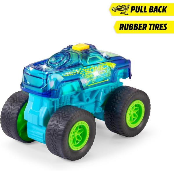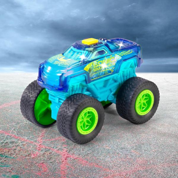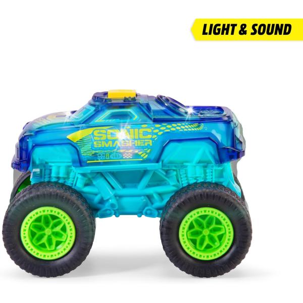 Velká show monster trucků – Stisknutím tlačítka se 17 cm vysoké autíčko „Sonic Smasher“ promění na pohyblivé pódium a předvede akční světelnou a zvukovou show.
