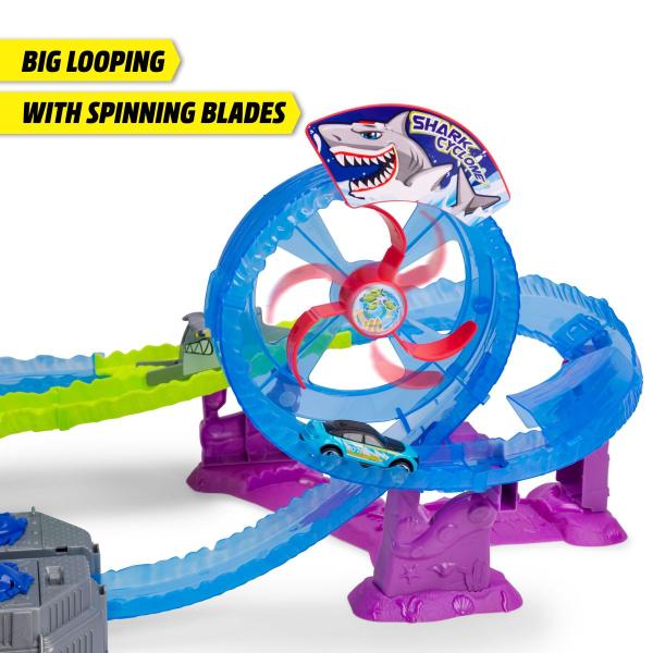 Auta se plnou rychlostí řítí smyčkou, procházejí vodním tunelem nebo přistávají přímo u velkého bílého žraloka – ale pozor, může kdykoli zkusit čelisti. Turbo booster přivádí vozidla na nejvyšší rychlost.