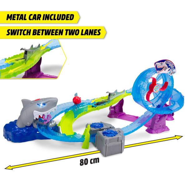 Autodráha White Shark s délkou 80 cm. Motorizovaná žraločí dráha se smyčkou. Světelná i zvuková funkce – hrozivé podvodní zvuky, světelné efekty a žraločí rev.