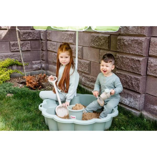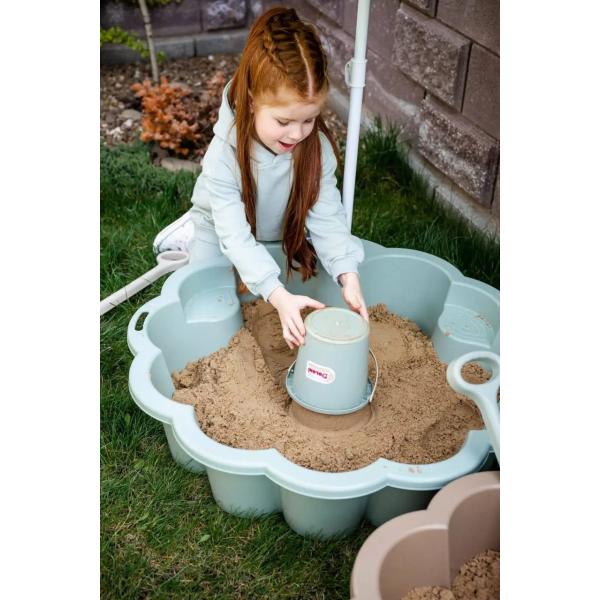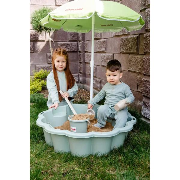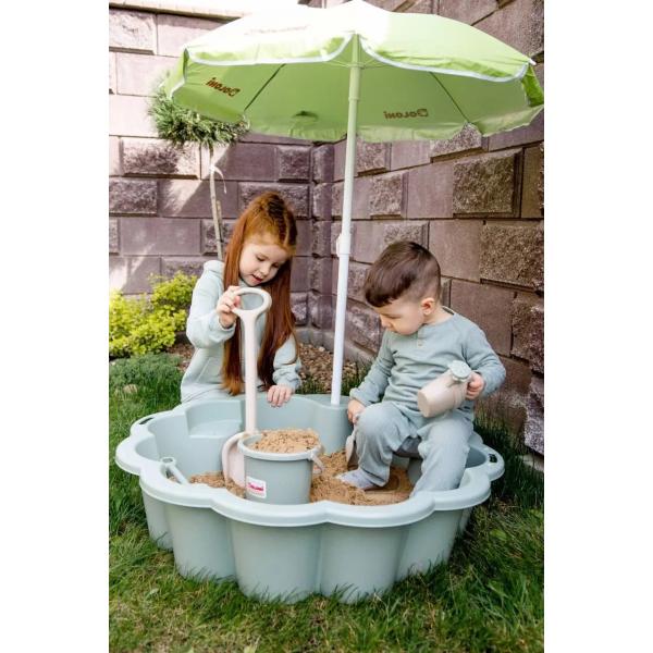 Pískoviště ve tvaru květu s 2 vnitřními sedadly a slunečníkem. Hlavní vlastnosti a výhody: