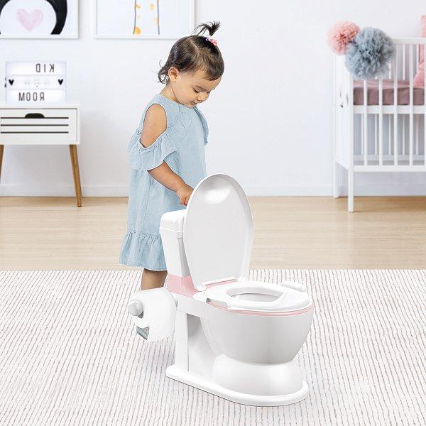 Tato věrná kopie toalety pro dospělé je skvělou variantou pro nejmenší děti, které už chtějí chodit na skutečný záchod jako dospělé. Přesto je základem tohoto výrobku vyjímatelný nočník, který je omyvatelný. Na boční straně toalety je držák na toaletní papír (papír není součástí balení). Na horní části toalety je splachovadlo, které vydává stejný zvuk jako při spláchnutí a zároveň má světelný efekt. V atraktivní bílo-růžové barvě. Rozměr toalety: výška 45cm x hloubka 38 cm x šířka 28 cm. Výška sedátka: 28cm. Rozměry balení: šířka 41cm x výška 30 cm x hloubka 28 cm Věk: 18m+