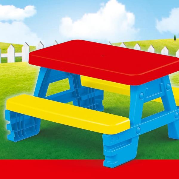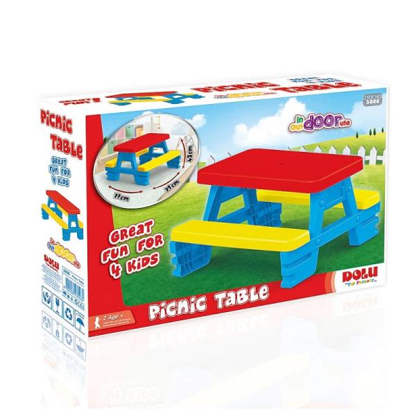 Dětský piknikový stůl od Dolu využijete jako venku na zahradě, tak i doma. Stoleček s lavicemi je vyroben z kvalitního a odolného plastu a nabízí pohodlné sezení až pro 4 děti. Ty jej mohou využívat při svých hrách a kreativních činnostech nebo si u něj vychutnat nejrůznější dobroty. Dívky i chlapci si oblíbí veselou barevnou kombinaci červené, žluté a modré. Rozměry stolu: 43 × 77 × 71 cm Hmotnost stolu: 5,2 kg Věk: 2+