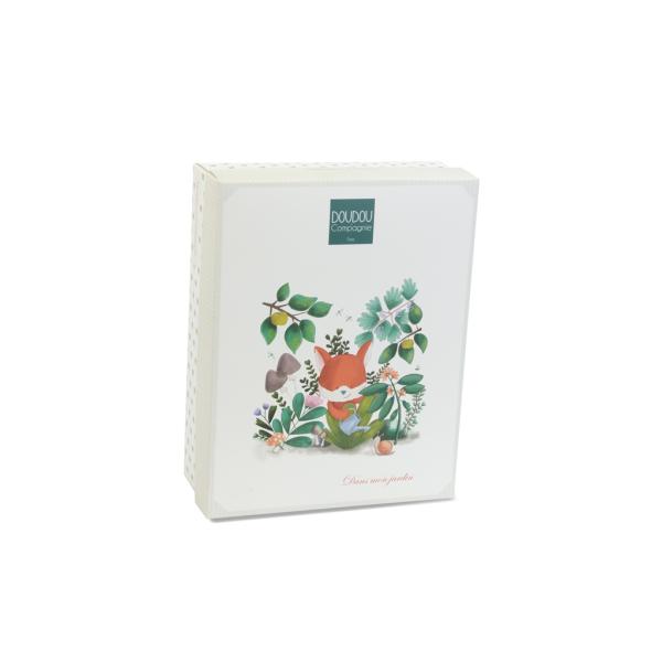 Hračka je zabalena v pěkné dárkové krabičce na uložení vzpomínek (fotografie a další připomínky narození a vývoje miminka) s veršovaným textem v angličtině na spodní straně.