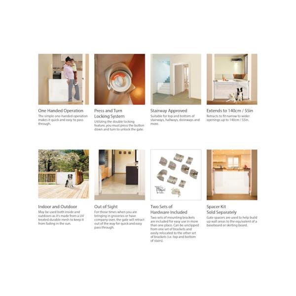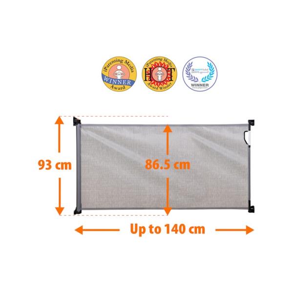 Tato zatahovací zábrana se hodí pro otvory až do 140 cm a poskytuje praktickou bariéru pro všechny druhy různých šířek a když se nepoužívá, šikovně se zasune zpět. Jednoduché uvolnění a vypnutí spony vám umožní přesunout ho z jednoho místa na druhé, s 2 sadami montážních konzol. Tato zábrana je vhodná pro použití v interiéru i exteriéru. Je pevná a robustní. Také nepředstavuje nebezpečí klopýtnutí, takže je ideální pro použití na schodech. Pokud se používá v exteriéru, doporučujeme ji během nepříznivého počasí přenést dovnitř. vlastnosti: Clip-on / Clip-off uvolnění. Vhodná pro otvory od 12 do 140 cm s výškou 93 cm. Součástí je sada 2 montážních konzol které umožňují použití zábrany na dvou různých místech. Otevírání a zamykání jednou rukou. Když se nepoužívá, jednoduše se zasune Robustní, odolné, průhledné pletivo. 2-směrné otvárenie Vyhovuje evropské normě EN 1930: 2011 Navrženo na ochranu dětí mladších 24 měsíců.
