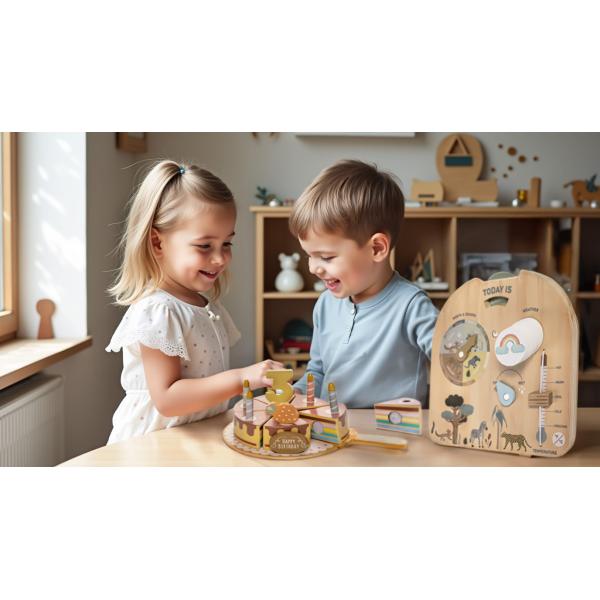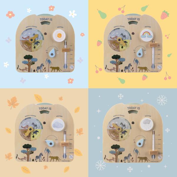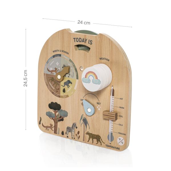 Tato deska je perfektní edukační pomůcka do domácnosti i mateřské školy. Umožňuje dětem pochopit denní rytmus, proměnlivost počasí i základní přírodní jevy zábavnou a názornou formou. Interaktivní provedení povzbuzuje děti k každodennímu používání – vybrat den, zhodnotit počasí za oknem, nastavit vlhkost i teplotu.