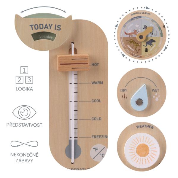 • Komplexní učení: Děti se učí rozlišovat dny v týdnu, měsíce, roční období, typy počasí, vlhkost i teplotu.• Vyměnitelné magnetické prvky: Včetně 6 kulatých destiček s různými ikonami počasí – slunce, déšť, sníh, duha, zamračeno a bouřka.