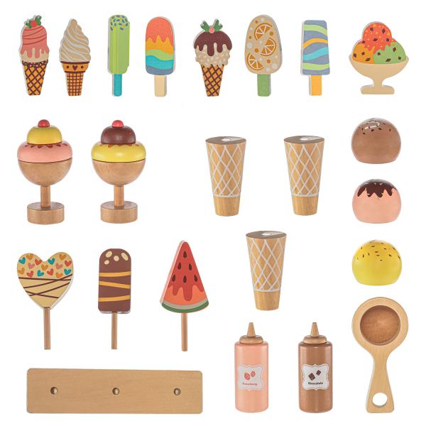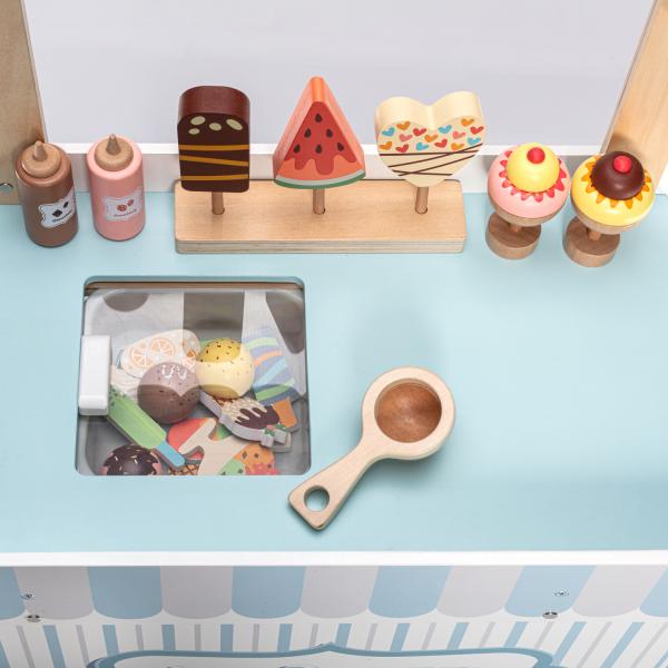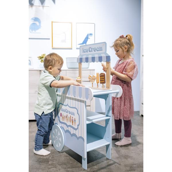 Pohodová zábava nejen v letních měsících Nyní si vaše děti mohou vychutnat lahodnou zmrzlinu nejen v létě. Tato propracovaná a barevná souprava je navržena tak, aby rozvíjela kreativitu, představivost a podporovala hravé hraní rolí. Krásně laděný vozík připomínající zmrzlinárnu je připraven vydat se na cestu do světa dětské fantazie. Děti si zamilují jeho autentický design a snadné ovládání. Děti si mohou užít hraní na skutečného zmrzlináře s nástrojem na krájení, který jim umožní vytvořit dokonalé a lahodné porce oblíbené zmrzliny. Souprava obsahuje také mrazící box, který slouží jako hračka a pomáhá dětem předstírat, že jejich zmrzlina je vždy čerstvá a chladná. Naše dřevěná zmrzlinárna je skvělý způsob, jak rozvíjet dětskou představivost a kreativitu, a než je bude neodolatelně bavit, můžete si dopřát chvilku pro sebe. Připravte se na nesčetné hodiny zábavy a chutných dobrodružství se svými malými zmrzlináři! – Vhodné pro děti od 3 let – Podporuje představivost – Rozvíjí sociální dovednosti – Součástí jsou papírové peníze – Kornouty, nanuky, kopečky na zmrzlinu – Naběračky na zmrzlinu – Krabice na mrazničku – rozměry 66,5 × 32 × 101 cm – Vyrobeno z odolného dřeva – Netoxické barvy – Celkem 24 doplňků – Umožňuje hru více dětí současně – Podporuje interakci a socializaci, když se hraje více dětí současně – Skvělý tip na dárek