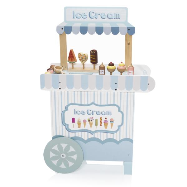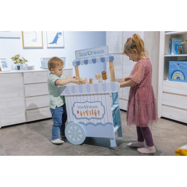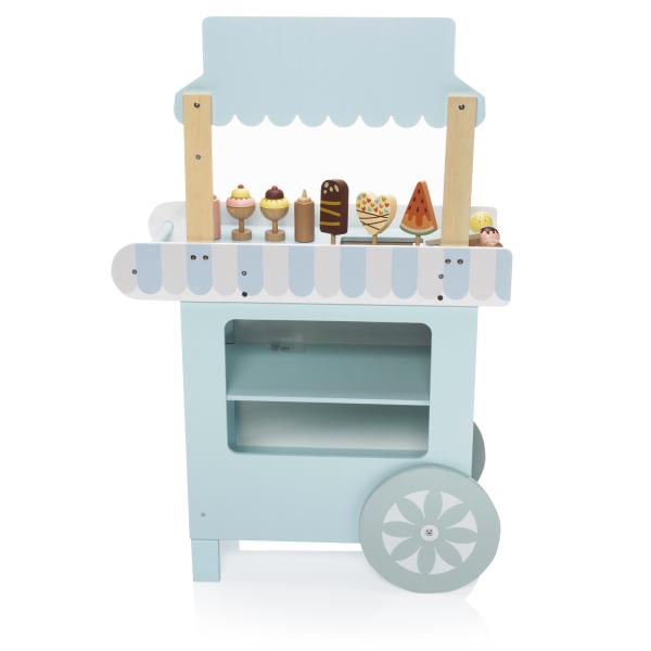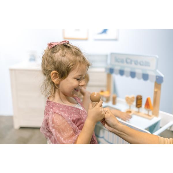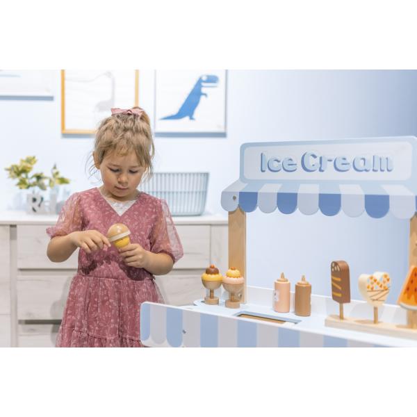 -1%Dřevěné zmrzlinářství set – kreativní hra pro děti, která rozvíjí představivost a hravé hraní rolí. Vozík připomínající zmrzlinárnu s nástrojem na krájení a dalšími doplňky.
