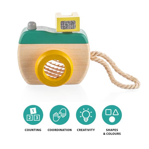 Dřevěný fotoaparát Green je ideální hračka pro malé fotografy. Pomáhá rozvíjet představivost, kreativitu a motoriku dětí od 16 měsíců.