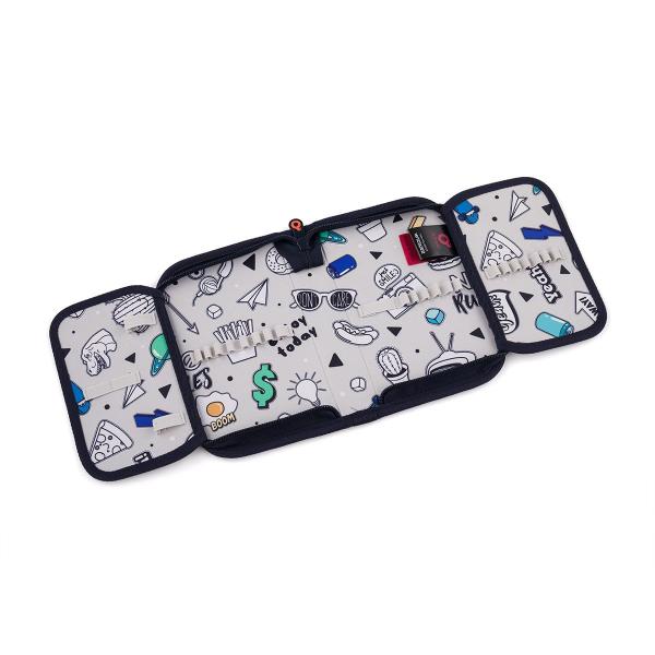Jednokomorový školní penál s dvěma klopami je vybaven 21 klasickými gumovými úchyty na pastelky a fixy, třemi širšími úchyty na pravítka, kružítko či nůžky, a dvěma většími úchyty na gumu a ořezávátko.