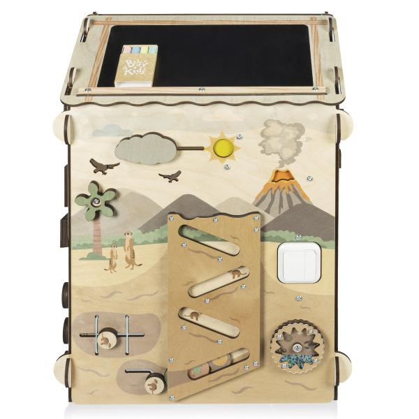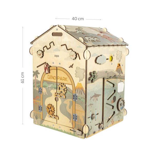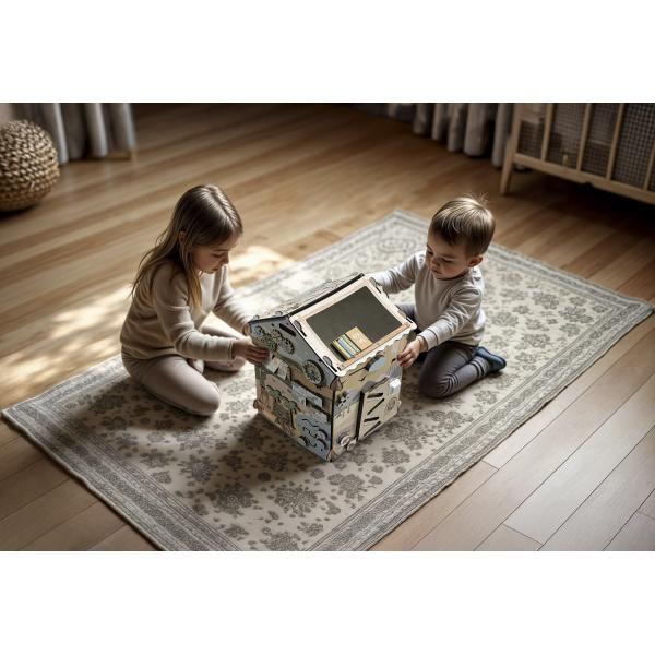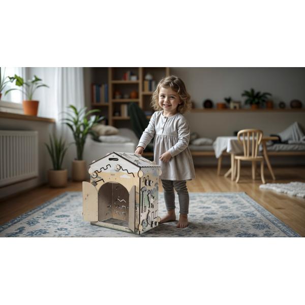 Praktické prvky…učíme se hrouNa boku domečku najdete šňůrku na provlékání, zipy, suchý zip, otočné obrázky i mechanický vypínač. Děti si tu nenásilně procvičují činnosti, které využijí v mateřské škole i doma.