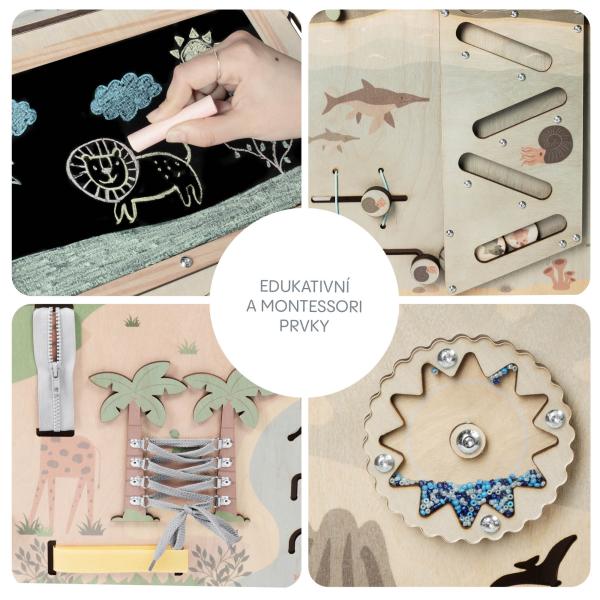 Zvířátka a safari scéna…poznávání přírody dotykemLev, pštros, žirafa, surikata nebo plameňák – všechna zvířata se hýbou, skládají nebo otáčejí. Učí děti poznávat svět, přírodu a zároveň rozvíjejí jemnou motoriku a logické myšlení.