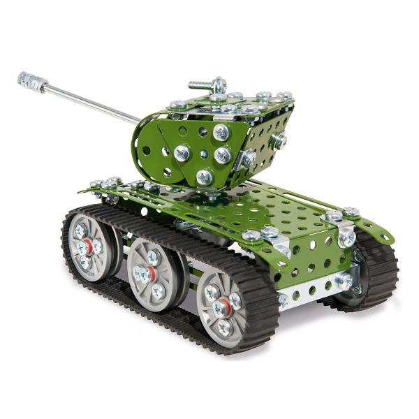 Detailní model Eitech – Tank v zeleném provedení je určen k hraní i sběratelským účelům. Hravou formou umožňuje dětem i dospělým objevovat svět techniky a zároveň trénovat jemnou motoriku a kreativitu.Pohyb rotující věže a plastových pásů podporuje trojrozměrné myšlení. Robustní kovová konstrukce zaručuje stabilitu a dlouhodobou zábavu. Všechny díly jsou kompatibilní s ostatními Eitech sety, což umožňuje nekonečné kombinace a rozšíření. Set obsahuje vhodné montážní nástroje a ilustrovaný návod.Obsah balení• Více než 280 dílků z pozinkované oceli a plastu• Montážní nástroje (klíč a šroubovák)• Ilustrovaný návod na sestavení minimálně tří různých modelůVýhody• Rozvoj technického myšlení: Stavění modelů podporuje logické a technické myšlení dětí.• Zlepšení motorických dovedností: Manipulace s malými dílky a nástroji pomáhá rozvíjet jemnou motoriku.• Kreativita a flexibilita: Možnost postavit různé modely z jednoho setu stimuluje kreativitu a představivost.• Vysoká kvalita: Dílky jsou vyrobeny z kvalitních materiálů, což zaručuje dlouhou životnost modelů.Obtížnost: pokročilý