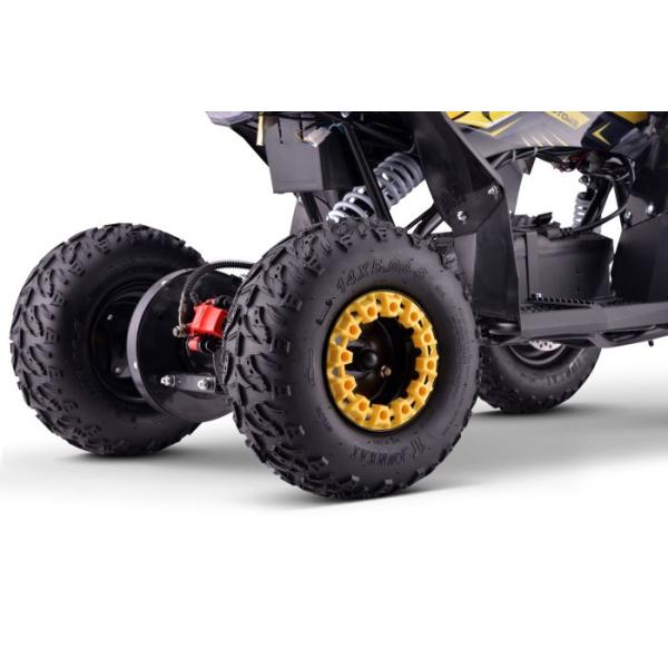 Prevrácená vidlice a nastavitelné zadní tlumiče poskytují optimální komfort na těžkých terénech, zatímco jeho ocelový rám zaručuje odolnost za všech podmínek. S baterií 48V (4X 12V12Ah) tento elektrický quad nabízí přibližně 1 hodinu nepřetržité jízdy, což umožňuje dětem užívat si jízdu bez přerušení.
