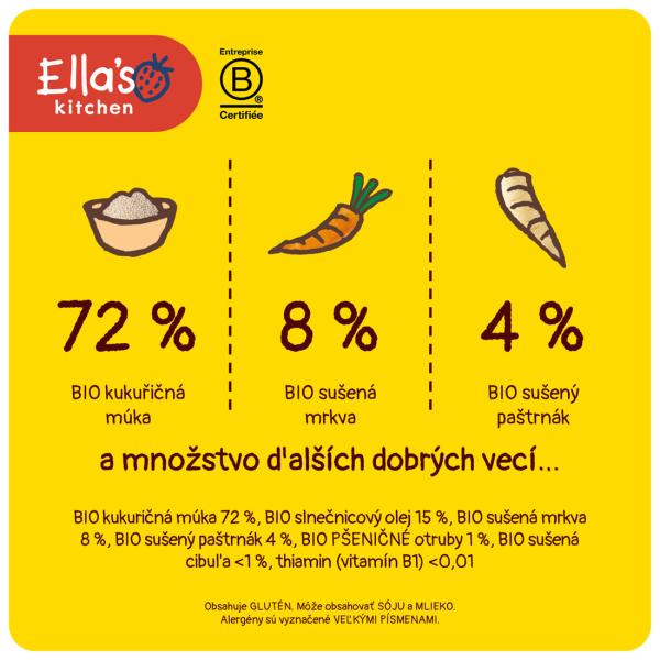 Tyto křupky budou vaše děti bavit. Kromě toho, že skvěle chutnají po mrkvi a pastináku, padnou dětem do ručičky a přímo vybízejí k tomu, aby se krmily samy. Hravou formou si tak procvičí jemnou motoriku a zlepší koordinaci ruka-oko. A pak už jen šup do úst, kde se na jazyku rozplynou. Pochutnávat si na nich mohou malí prcky od 6 měsíců, a to bez výčitek. Neobsahují totiž žádné přidané cukry ani sůl a ani umělá barviva. Hlavní vlastnosti BIO kvalita bez přidaného cukru a soli bez umělých barviv a konzervantů bez laktózy tvar přizpůsobený dětskému úchopu Složení: BIO kukuřičná mouka 72%, BIO slunečnicový olej 15%, BIO sušená mrkev 8%, BIO sušený pastinák 4%, BIO PŠENIČNÍ otruby < 1%, bio sušená cibule < 1%, thiamin (vitamín b1) < .. může obsahovat sÓji a mlÉko. obsahuje lepok. alergeny jsou vyznačeny velkÝmi pÍsmeny. Výživové údaje na 100 g: Energie 1765 kJ / 420 kcal; tuk 15,8 g, z toho nasycené mastné kyseliny 1,7 g; sacharidy 59,4 g, z toho cukry 4,5 g; vláknina 7,0 g; bílkoviny 6,6 g; sodík 0,01 g; sůl 0,01 g (obsah soli je dán přirozeně se vyskytujícím sodíkem v surovinách); thiamin (vitamin B1) 0,80 mg. Důležité upozornění: Při konzumaci nenechávejte dítě bez dozoru a vleže. Nebezpečí vdechnutí výrobku. Balení není určeno ke hraní. Potravina pro zvláštní výživové účely. Potravina určená pro kojence a malé děti od ukončeného 6. měsíce. Extrudováno. Pro děti od 6 měsíců