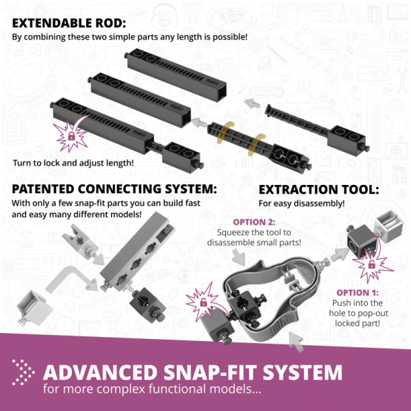 Dozvíte se vše o Newtonových pohybových zákonech, které jsou základem klasické mechaniky, která stále popisuje většinu každodenních životních situací. Experimentujte s kinetickou a potenciální energií, abyste objevili vlastnosti energie a jak se transformuje z jedné formy do druhé. Postavte si 8 funkčních modelů, jako je balistický katapult, gravitační ventilátor, kolizní auto, pohyblivá kabina, letadlo poháněné balonem a dragster. Jednoduché návody na sestavení všech modelů naleznete buď online, nebo v přiložené brožuře. Brožura poskytuje podrobná vysvětlení různých použitých vědeckých principů a zahrnuje inovativní experimentální aktivity pro praktické učení. K dispozici je také sekce Kvíz, ve které můžete otestovat své nově nabyté znalosti!