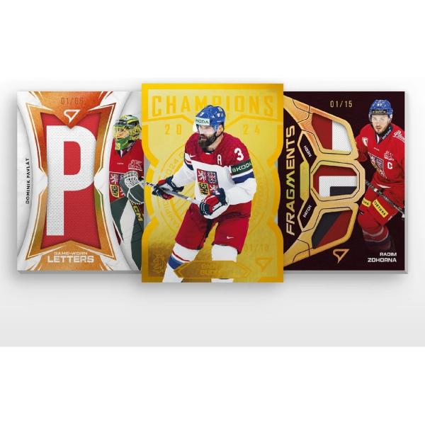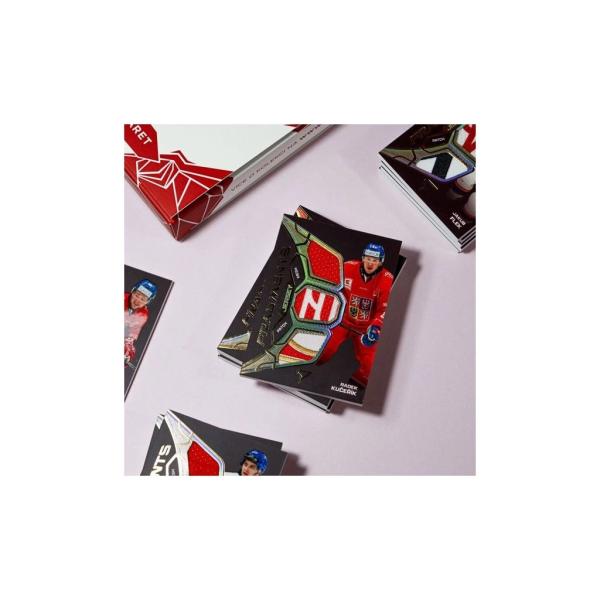 kartička s kouskem hraného dresu reprezentanta Jersey Fragments – Level 3 x/15,karta s autentickým kouskem hokejky Blade Force x/35 a její verze s podpisemAuto x/20 a Nameplate Auto 1of1 s částí hokejky s jménem hráče, unikátní kartas nášivkou National Thread – Patch x/25, případně s výsekem z loga na dresuLogo Patch x/15 nebo karta s písmenem z menovky Game-Worn Letters.