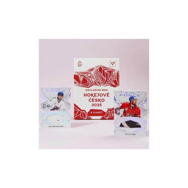Exkluzivní box hokejových karet Hokejové Česko 2025 obsahuje 6 kartiček. Najdete v němnejvzácnější kartičky kolekce.Každý Exkluzivní box garantuje jednu kartu Dynamic Connections 3D. V boxu jegarantován zisk dalších pěti vzácných karet z následujících: