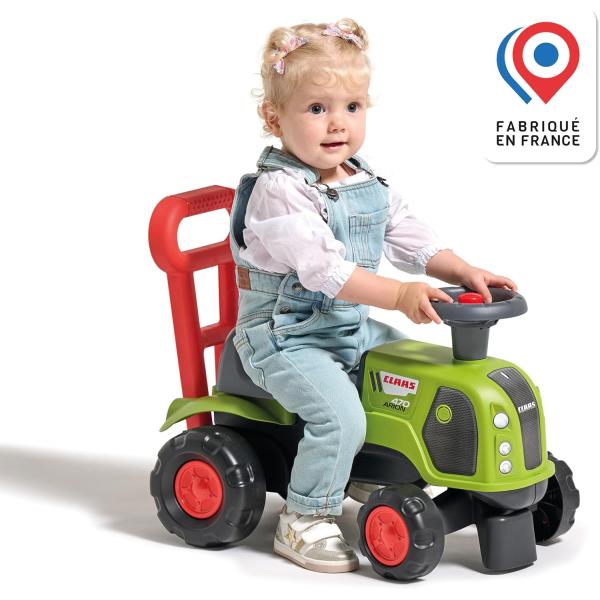 Roztomilý malý traktor Claas, který bude doprovázet vaše dítě od 12 měsíců až po jeho první krůčky díky pomůcce na chůzi. Je vybaven směrovým volantem s klaksonem, který pomáhá rozvíjet jemnou a hrubou motoriku a zároveň se zabaví při přecházení z jednoho konce domu nebo zahrady na druhý.Tento traktor Claas Arion 470 je vyroben výlučně ve Francii z nejméně 90 % recyklovaného plastu a byl navržen tak, aby vydržel!