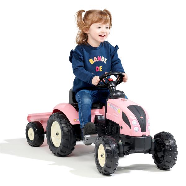 Šlapací traktor Country Star v růžové barvě s přívěsem od výrobce FALK je snem každého malého traktoristy. Pečlivě vyrobeno, s důrazem na nejmenší detail, určené pro děti od 2 let. Vůz je vybaven odnímatelným přívěsem s panely a volantem s klaksonem. Charakteristika: pro děti od 2 let, nosnost do 30 kg, klakson na volantu, rozměry traktoru jsou 123 x 42 x 53 cm řetězový pohon na zadní nápravu, odpojitelný přívěs, řízená přední náprava, tichá kola vyrobená z kvalitního plastu, stabilní a bezpečný design. Falk je přední evropský výrobce vysoce kvalitních pedálových vozidel. V nabídce společnosti jsou traktory licencovány značkami jako Claas, Renault, McCormick, Kubota, Case IH a jiné. Všechna vozidla jsou vyráběna ve Francii z kvalitních materiálů.