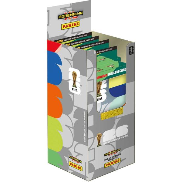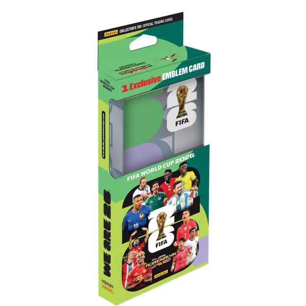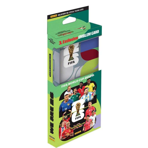 Sběratelské karty FIFA WORLD CUP 2026. Plechová krabička obsahuje: 4 balíčky karet (balíček obsahuje 8 karet), 2 Limitované karty a 1 kartu Exclusive EMBLEM.