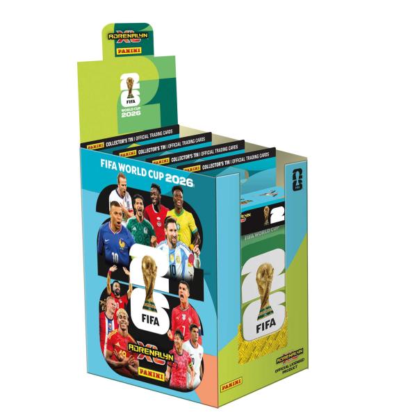 Sběratelské karty FIFA WORLD CUP 2026 – ADRENALYN. V plechové krabičce je 32 karet + 3 limitované karty.
