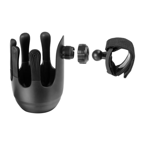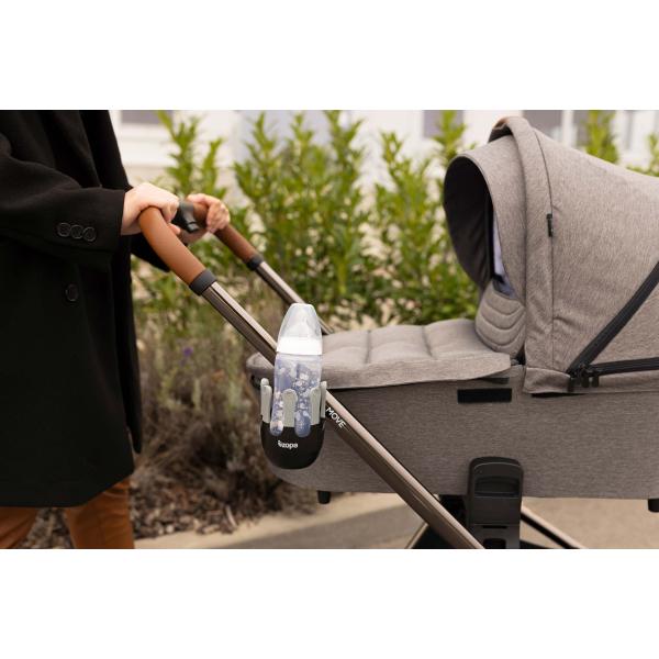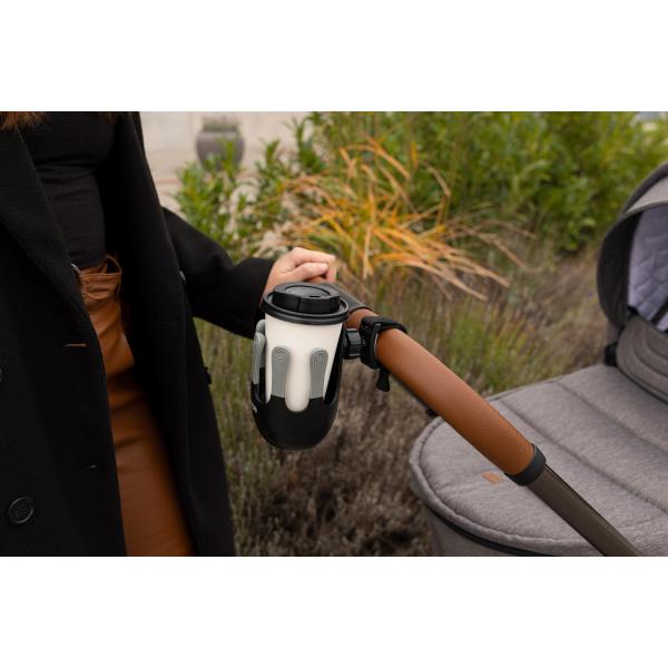 Flexibilní držák na nápoje je navržen tak, aby se do něj vešly dětské lahve, šálky na kávu a větší lahve na vodu s průměrem do 8,5 cm. 360° otočný systém lze díky jednoduché instalaci na suchý zip připevnit na rukojeť téměř každého kočárku. Jedinečný, moderně vypadající systém pěti prstů zajišťuje lepší stabilitu sklenice nebo lahve a zabraňuje náhodnému vylití.