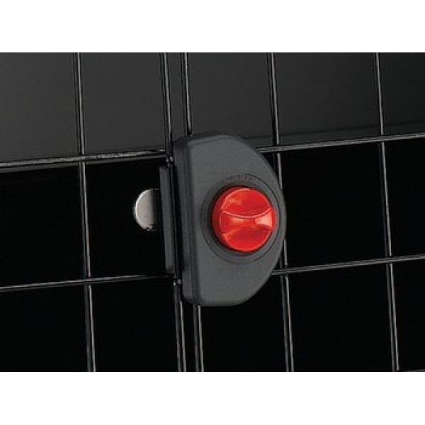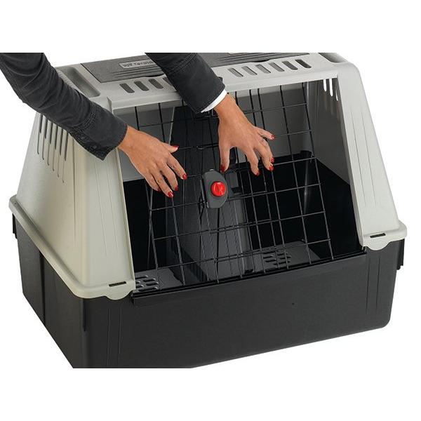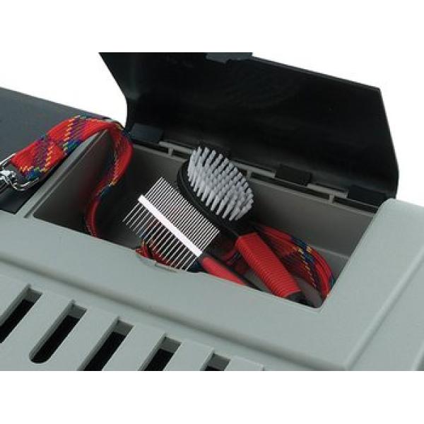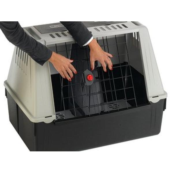 Plastová přepravka s ocelovými dveřmi do auta. Přepravka s bezpečnostním zámkem a posuvnými dveřmi pro umístění v kufru vašeho auta. Se spodním roštem a velkými ventilačními otvory. V horní části je umístěn box na chovatelské potřeby. Přepravku lze rozdělit překážkou, která není součástí balení. Rozměry: 100 x 60 x 66 cm.