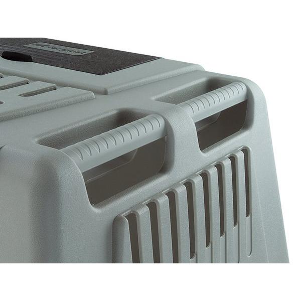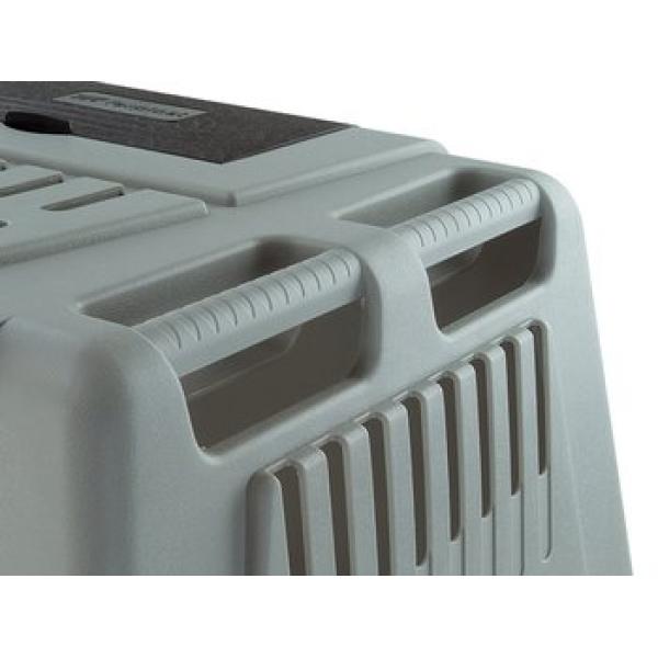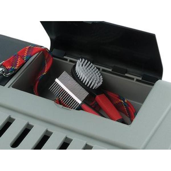 Plastová přepravka s ocelovými dveřmi do auta. Přepravka s bezpečnostním zámkem a posuvnými dvířky pro umístění v kufru vašeho auta. Se spodním roštem a velkými ventilačními otvory. V horní části je umístěn box na chovatelské potřeby. Velikost: 82 x 51 x 61 cm. Nosnost: 20 kg
