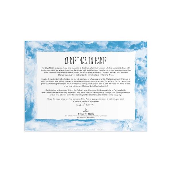 Fóliové puzzle od Michaela Storringsa zobrazuje radost z Vánoc v ulicích Paříže. Toto puzzle je tou správnou výzvou pro celou rodinu. Části motivu mají speciální povrch, který se na světle z různých úhlů kovově leskne a vytváří tak dojem, že je puzzle ze zlata, stříbra a dalších lesklých kovů.