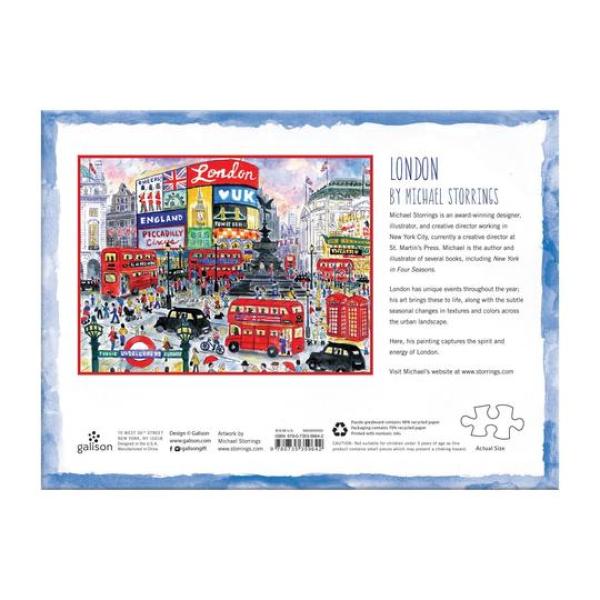 Oceněný ilustrátor Michael Storrings ve svém umění zachycuje zvláštní podstatu míst. Puzzle s detailní ilustrací Londýna s 1000 dílky oživuje ruch Piccadilly Circus. Puzzle jsou zabalené v pevné krabici.