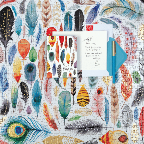 Toto 500 dílné puzzle se vyznačuje zářivými akvarelovými peřími od výtvarnice Margaret Berg. Akcenty zlaté fólie vytvářejí úžasný vzor peří, který se spojuje kousek po kousku.