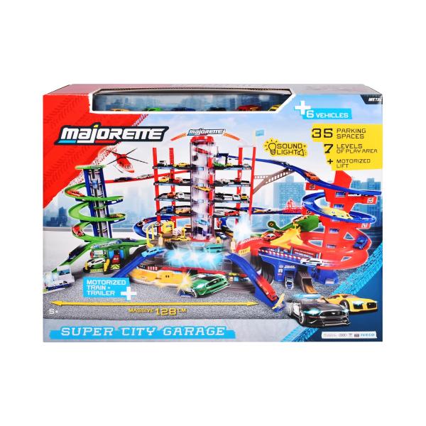 Velká hrací garáž se šířkou téměř 1,30 m je největší nový výrobek ve světě Majorette! Garáž se skládá ze sedmi herních ploch a má až 35 parkovacích a skladovacích prostorů. Srdcem stanice je motorový spirálový výtah, který současně nese až devět kovových autíček. Ihned jak jsou nahoře, automatické přepínače rozdělují auta do čtyř různých jízdních pruhů. Šest různých světelných a zvukových efektů, stejně jako nespočetné množství herních stanic, jako je vlaková stanice, čerpací stanice s benzínovým čerpadlem, autoservis a myčka aut, požární stanice, policejní stanice s tajným úkrytem nebo heliport, nabízí neomezenou zábavu. Součástí je 6 kovových autíček, vlak poháněný na baterie, automatické výhybky, tunel s funkcí havárie a 2 motorové výtahy. Vrtulník není součástí. Rozměry po sestavení: 128 x 78 x 73 cm.