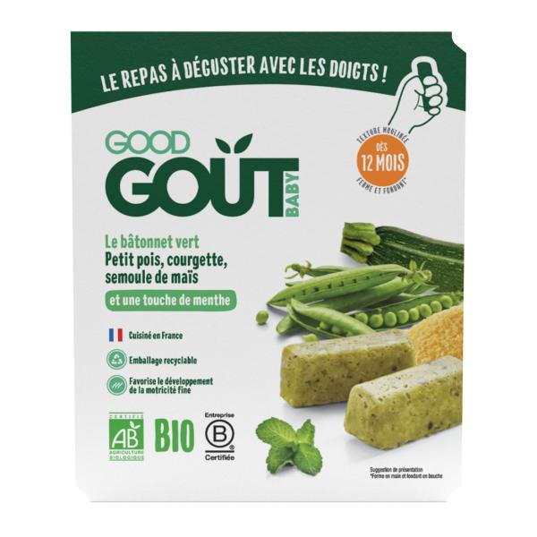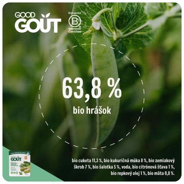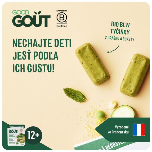 Dejte dětem svobodu a nechte je jíst podle jejich gustu! Good Gout vás provází v každé fázi života vašeho děťátka! Představujeme vám tyto BLW gurmánské tyčinky, které dětem perfektně padnou do ruky, snadno se jim drží a podporují správné stravovací návyky. Posilují samostatnost a umožňují jim samostatně ochutnávat a rozvíjet jejich motoriku a koordinaci. Dejte dětem svobodu v jídle! Díky tomu bude pro ně v pozdějším věku snazší vybírat si zdravé potraviny. Hrášek a cuketu doplňuje další gurmánská ingredience: jemná kukuřičná mouka. To vše doprovázeno šéfkuchařským dotekem: kapkou citrónové šťávy a jemným tónem máty. BLW nebo Baby Led Weaning je metoda, kdy děťátko již odmala je samé a není nikým krmeno. Má hned několik výhod: • Dítě se samé rozhodne, kolik a čeho sní. • Procvičuje si motoriku. • Učí se nejprve kousat a teprve potom polykat. • Odpadá proto jakékoli mixování a krmení lžičkou. • A to hlavní: celá rodina může jíst spolu! ? Věděli jste, že … …tento trend má kořeny v anglosaské kultuře, odkud se rozšířil do Spojených států a úspěšně zakotvil iu nás? …podle průzkumu metodu BLW již využívá 30 % rodičů a jejich počet neustále roste? Tento zcela nový plně recyklovatelný formát obsahuje 6 samostatných tyčinek, které lze snadno vložit do tašky a vzít kamkoli. Obalový materiál neobsahuje bisfenol A ani ftaláty v souladu s platnými předpisy. Složení: *hrášek 63,8%, *cuketa 11,3%, *kukuřičná mouka 8%, *bramborový škrob 7%, *šalotka 5%, voda, *citronová šťáva 1%, *řepkový olej 1%, *máta 0 ,8 %. *z ekologického zemědělství. Výživové údaje na 100 g: energie 551 kJ / 131 kcal, tuky 2,2 g, z toho nasycené mastné kyseliny 0,1 g, sacharidy 19 g, z toho cukry 1,5 g, vláknina 3,0 g, bílkoviny 6, 8 g, sůl 0,14 g (obsah soli je dán přirozeně se vyskytujícím sodíkem v surovinách), sodík 0,06 g. Návod k použití: – Na pánev přidejte malé množství tuku spolu s tyčinkami a zahřívejte na mírném plameni po dobu několika minut. – Pokud spěcháte, můžete tyčinky zahřát po dobu 10 sv mikrovlnné troubě při výkonu 800 W. Zkontrolujte teplotu a začněte podávat! Obal nikdy nedávejte do mikrovlnné trouby ani dětem na hraní. Dodržujte pokyny. • Tip: Tepelně upravené tyčinky si můžete vzít sebou na cesty a podávat je při izové teplotě. Minimální trvanlivost do: viz zadní strana obalu. Skladujte při pokojové teplotě. Po otevření skladujte v chladničce a spotřebujte do 24 hodin. Zeleninově-luštěninový příkrm od ukončeného 12. měsíce. Sterilizováno. Potravina pro malé děti.