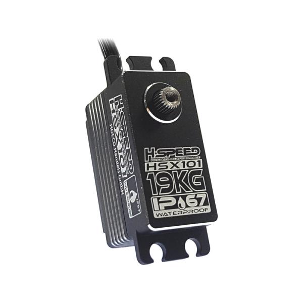 Charakteristika:Nízké digitální servo H-Speed HSX101 se střídavým motorem. Celohliníková CNC krabička, 2x kuličkové ložisko, kovové převody, magnetický enkodér polohy, voděodolné (IP67), napájení 4.8-8.4V, moment 13-19kg.cm, rychlost 0,11-0,073s/60°, hmotnost 54,5g, rozměry: 40x20x26mm. Tisícihran 25T.