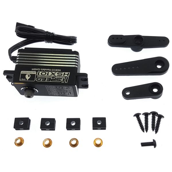 Obsah balenia:Balení obsahuje servo HSX101, prodlužovací servo kabel, 3x páku serva (jednostranná R – 30mm, jednostranná R – 18mm, dvoustranná D – 38mm), šroub páky, 4x silentblok s kovovu vložkou, 4x šroub pro uchycení serva.Odporúčame dokúpiť:Páka serva