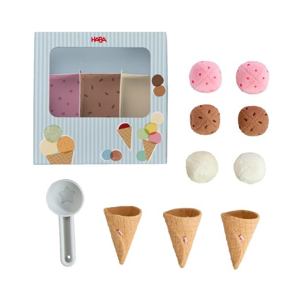 Sada obsahuje látkové kopečky zmrzliny s příchutěmi jako jahoda, čokoláda či vanilka, které se dají díky všitým magnetům na sebe dětsky snadno ukládat a kombinovat.