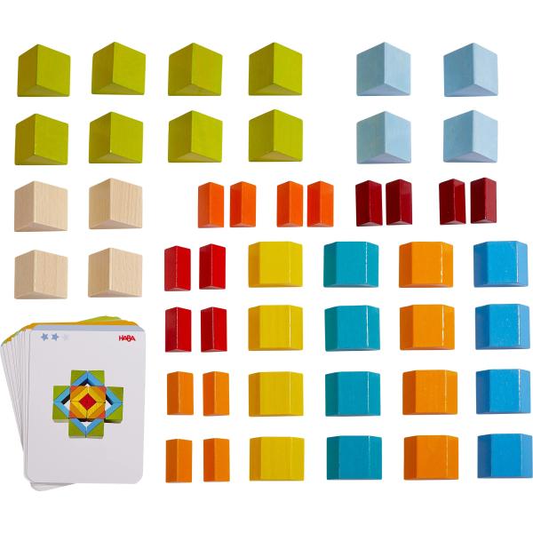 Díky 48 dřevěným blokům různých tvarů a barev si děti mohou postavit cokoliv, co je napadne. Pro ještě více zábavy a inspirace je součástí balení 10 oboustranných šablon s ukázkami možných staveb. Každý nový výtvor rozvíjí jemnou motoriku, prostorovou představivost a učí děti trpělivosti.