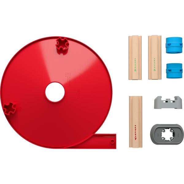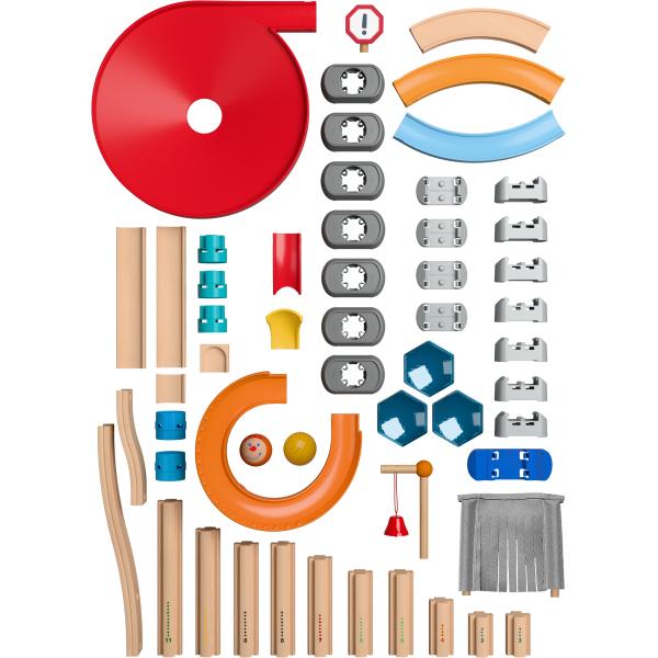 Krabice pro skvělou zábavu při stavění kuliček, a to i pro ty úplně nejmenší! 56 jednotlivých dílků a samotná krabice se dají poskládat a vytvořit tak minimálně 10 různých drah – vždy přizpůsobených aktuální vývojové fázi dítěte.