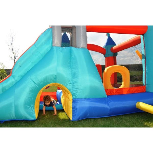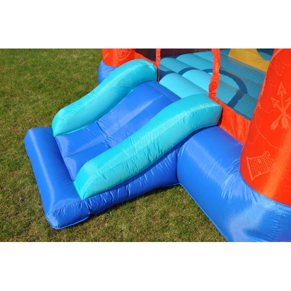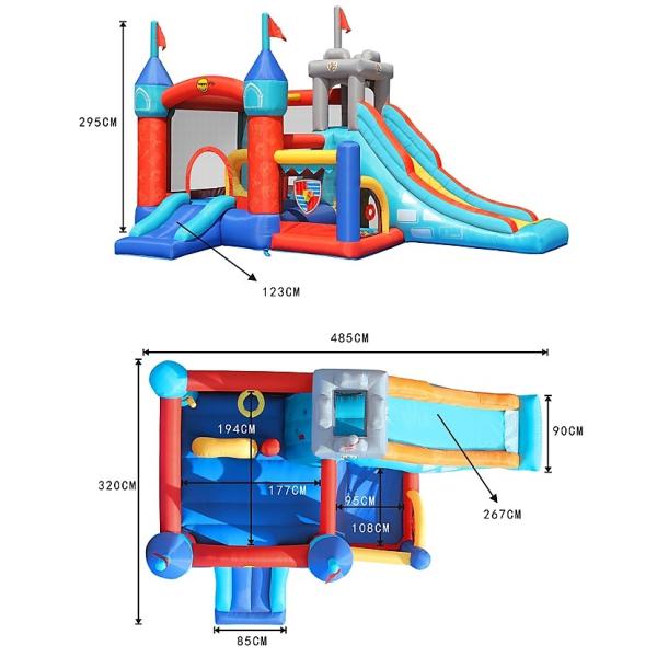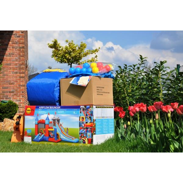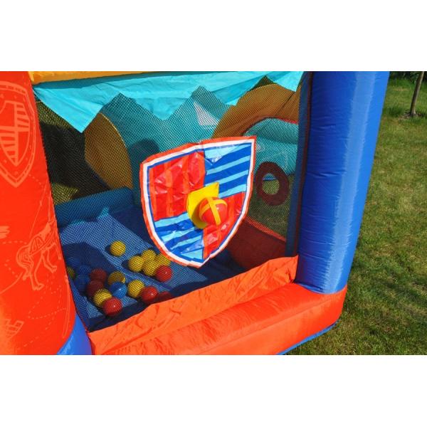 Rytířský hrad nabízí obrovskou skokanskou plochu 15,5 m2, lezecké stěny, tunely, překážkovou dráhu, terče, házecí koše, hrací místo s míčky a senzační skluzavky. Barevný nafukovací hrad s rytířskou tématikou nadchne všechny děti Skákací hrad je vyroben z kvalitního laminovaného PVC a nylonové tkaniny Rytířský hrad nabízí mnoho aktivit pro ještě více zábavy Díky pevným bezpečnostním sítím nehrozí vypadnutí dítěte z hradu Vnitřně šité vzduchové komory rovnoměrně rozvádějí vzduch je 225 kg Minimální věk na skákání v hradě jsou 3 roky. Obsah balení: Skákací hrad Ventilátor Přenosný vak Kolíky na kotvení Opravná sada 30 × hrací míček 2 × házecí míček Návod k použití v českém jazyce PARAMETRY: Délka: cca 4,85 m Šířka: cca 3,20 m Výška: cca 2,95 m Podlahová plocha: cca 15,52 m2 Skákací plocha cca 1,94 x 1,78m Maximální nosnost: 270 kg (6 dětí) Maximální bodové zatížení: 45 kg Věk 3 – 10 let Výrobce si dal záležet na bezpečnosti skákacího hradu nejen již zmiňovanými nylonovými sítěmi, ale také kotvením hradu pomocí přiložených kolíků. Krytí ventilátoru zase poskytuje ochranu před poškozením při vniknutí cizích předmětů, prachu či vody. Ventilátor Rytířského hradu je chráněn proti vniknutí těles o průměru 12,5 mm, proti stříkající vodě a před dotykem prstem (IP24B). Hrad byl prověřen testem TÜV. Kdo by netoužil mít na zahradě vlastní skákací hrad! Skákací hrad Rytířský hrad nabízí obrovskou skokanskou plochu 15,5 m2, lezecké stěny, tunely, překážkovou dráhu, terče, házecí koše, hrací místo s míčky a senzační skluzavky. Bezpečí dětí během skákání zajišťují pevné nylonové sítě po celém obvodu hradu, s výjimkou vstupů na skluzavky. Hrad je vyroben z odolného laminovaného PVC. Pro rovnoměrné rozvádění vzduchu a menší námahu materiálu slouží vnitřně šité vzduchové komory. Ventilátor musí hrad dofukovat po celou dobu skákání, neboť dochází k malému úniku vzduchu dilatačními spárami a přes otvory stehů.