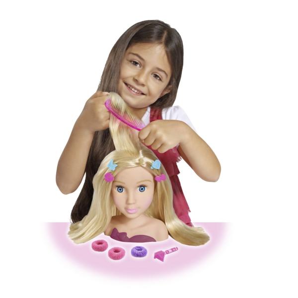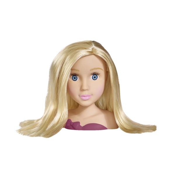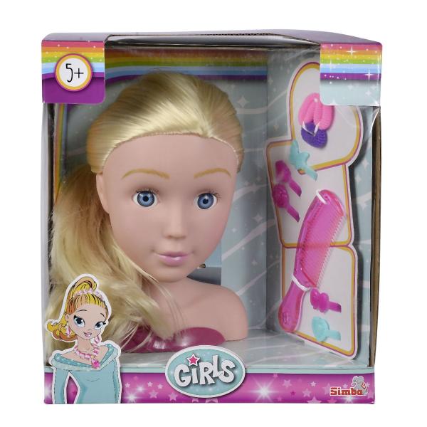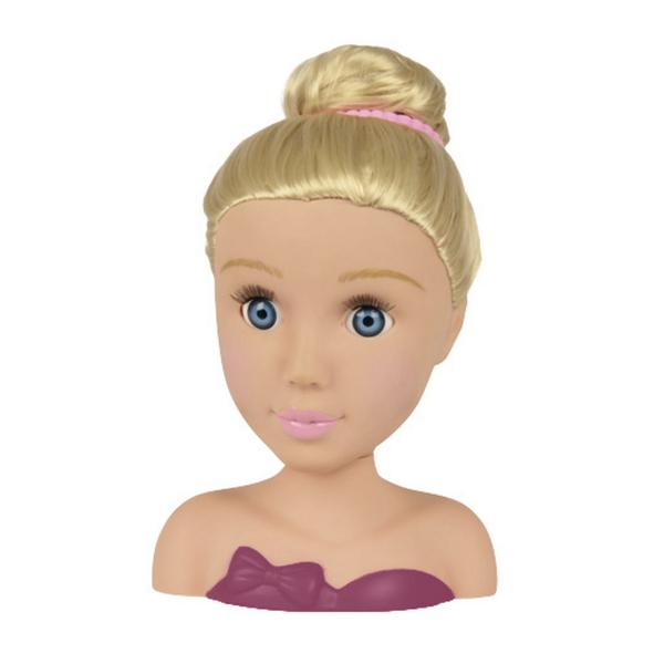 Hlava na zkoušení trendy účesů. Nezbytné doplňky jsou součástí, např. sponky, klipsy do vlasů, hřeben, hřebínek. Celkem obsahuje 10 ks příslušenství. Výška 19 cm.