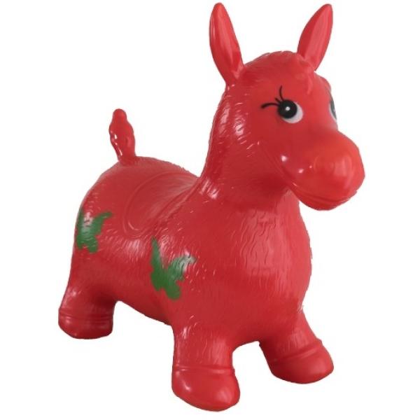 Gumové červené nafukovací skákadlo pro děti, ve tvaru poníka z pryže, s motýlky, baleno ve vyfouknutém stavu v sáčku. Vhodné od 3 let