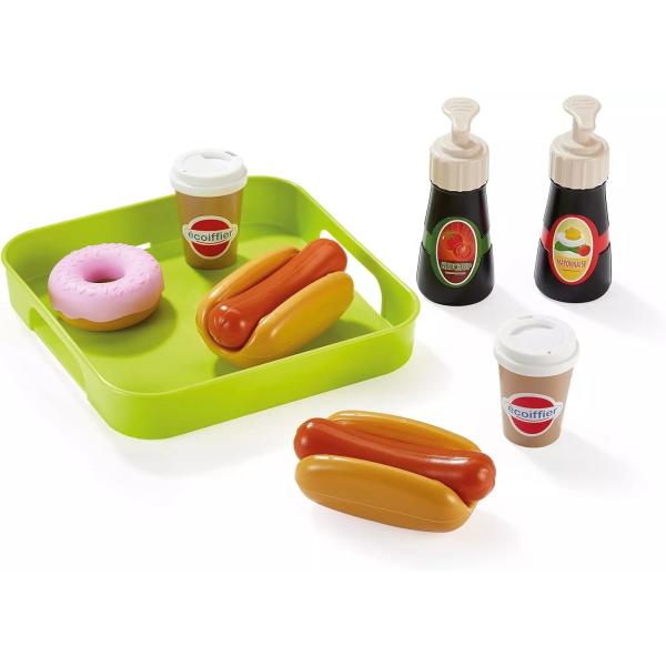 Tento zábavný Ecoiffier herní set obsahuje tác s 2 velkými hotdogy, dezertem v podobě donutu a 2 kávovými pohárky na cesty.